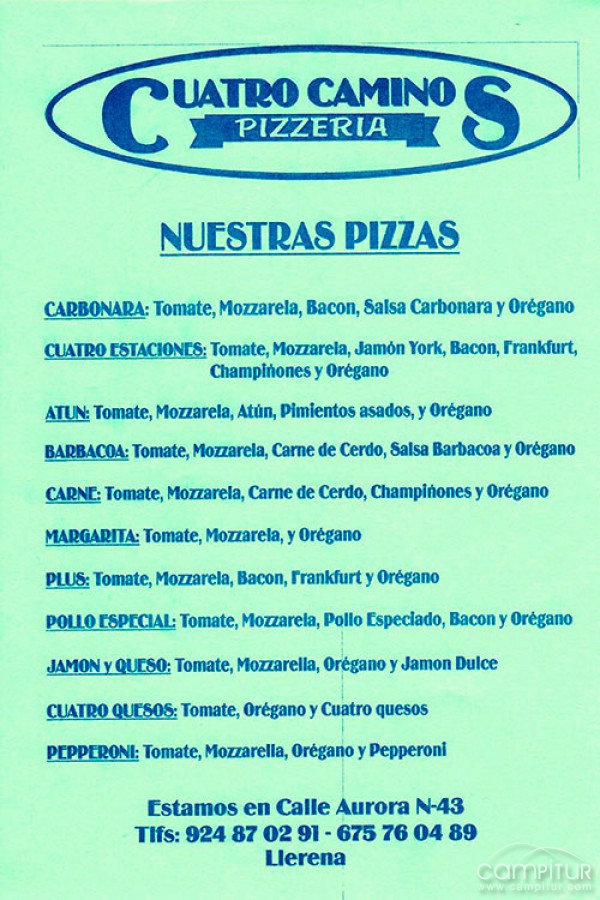 Pizzería Cuatro Caminos abre sus puertas en abril de 2015 bajo la dirección de Fernando Vizuete, empresario con gran experiencia, que comenzó elaborando pizzas para algunos locales de hostelería de la localidad y debido al gran éxito de sus pizzas decidió abrir una pizzería de venta al público.